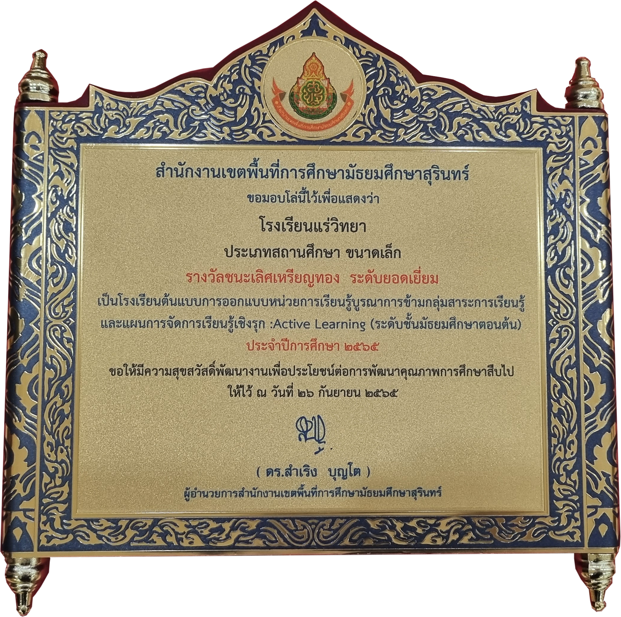 | 24 ก.ย. 2565 | ชนะเลิศ เหรียญทอง ระดับดีเยี่ยม โรงเรียนต้นแบบการออกแบบหน่วยการเรียนรู้บูรณาการข้ามกลุ่มสาระการเรียนรู้ และแผนการจัดการเรียนรู้เชิงรุก (Active Learning) ประเภทโรงเรียนมัธยมศึกษาขนาดเล็ก ระดับมัธยมศึกษาตอนต้น และ ระดับมัธยมศึกษาตอนปลาย | สำนักงานเขตพื้นที่การศึกษามัธยมศึกษาสุรินทร์ | ประกาศ โล่รางวัล ม.ต้น โล่ รางวัล ม.ปลาย |