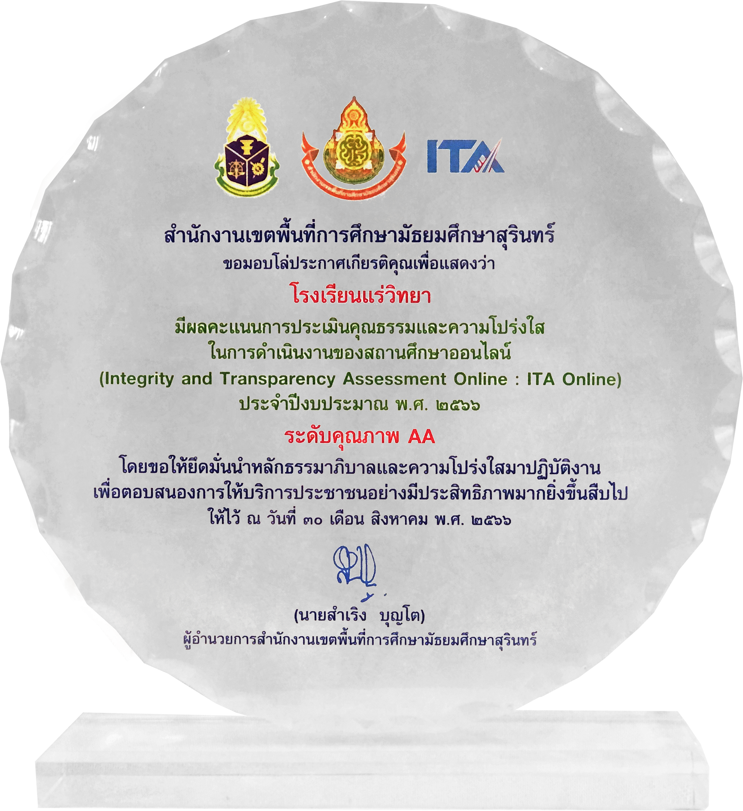| 1 ต.ค. 2565 | ผลการประเมินคุณธรรมและความโปร่งใสในการดำเนินงานของสถานศึกษาออนไลน์ (ITA Online) ปีงบประมาณ พ.ศ. 2565 ระดับคุณภาพ AA ผลคะแนน 95.31 คะแนน | สำนักงานเขตพื้นที่การศึกษามัธยมศึกษาสุรินทร์ | ประกาศเกียรติบัตร โล่รางวัล |