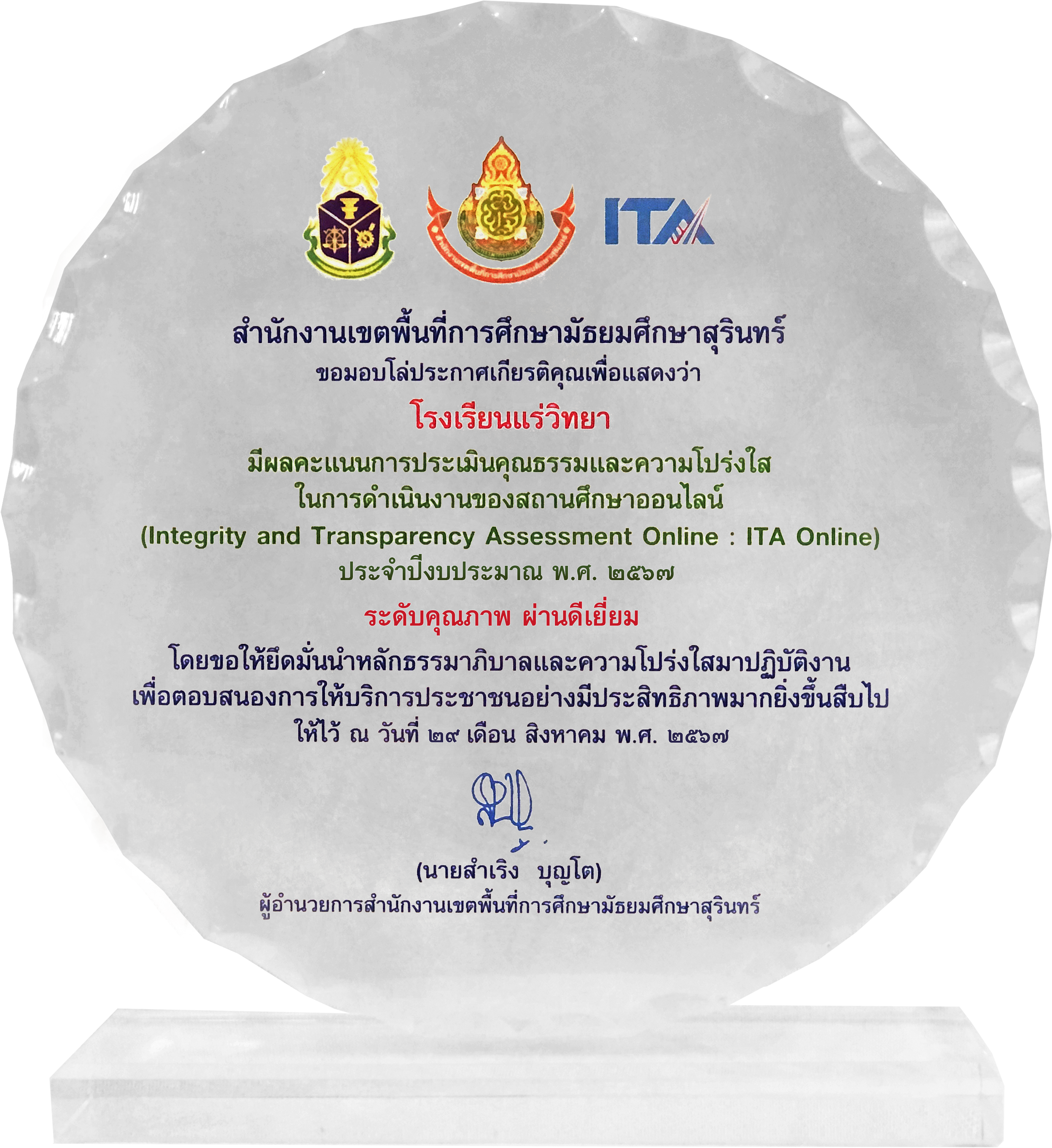 | 31 ก.ค. 2568 | ผลการประเมินคุณธรรมและความโปร่งใสในการดำเนินงานของสถานศึกษาออนไลน์ (ITA Online) ปีงบประมาณ พ.ศ. 2568 ผ่านระดับดีเยี่ยม ผลคะแนน 99.18 คะแนน | สำนักงานเขตพื้นที่การศึกษามัธยมศึกษาสุรินทร์ | ประกาศ เกียรติบัตร |