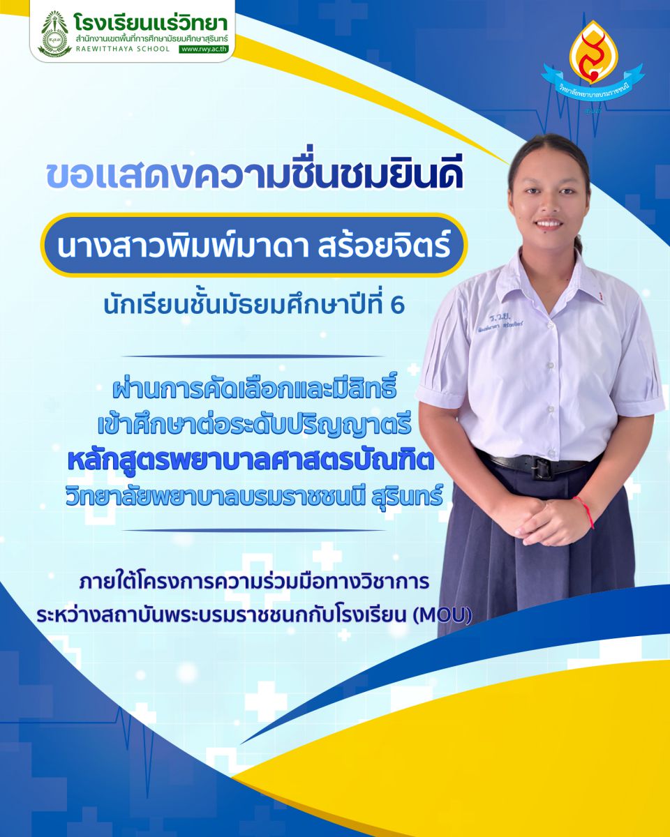 โรงเรียนแร่วิทยา ขอแสดงความชื่นชมยินดีกับ นางสาวพิมพ์มาดา สร้อยจิตร์ นักเรียนชั้นมัธยมศึกษาปีที่ 6 ในโอกาสผ่านการคัดเลือกและมีสิทธิ์เข้าศึกษาต่อระดับปริญญาตรี "หลักสูตรพยาบาลศาสตรบัณฑิต" วิทยาลัยพยาบาลบรมราชชนนี สุรินทร์ ภายใต้โครงการความร่วมมือทางวิชาการระหว่างสถาบันพระบรมราชชนกกับโรงเรียน (MOU)