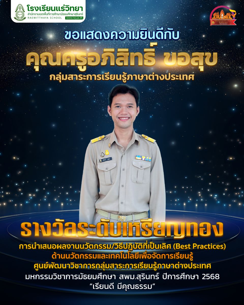 - 2. คุณครูอภิสิทธิ์ ขอสุข รางวัลเหรียญทอง การประกวดวิธีปฏิบัติที่เป็นเลิศ (Best Practices) ด้านนวัตกรรมและเทคโนโลยีเพื่อการเรียนการสอน ประเภท การพัฒนาการจัดการเรียนรู้โดยการเปิดชั้นเรียน (Lesson Study) กลุ่มสาระการเรียนรู้ภาษาต่างประเทศ