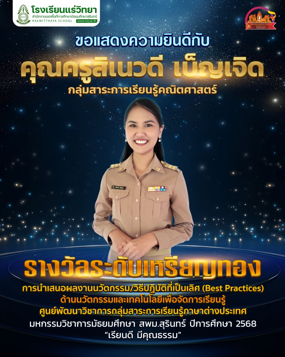 - 3. คุณครูสิเนวดี เบ็ญเจิด รางวัลเหรียญทอง การประกวดวิธีปฏิบัติที่เป็นเลิศ (Best Practices) ด้านนวัตกรรมและเทคโนโลยีเพื่อการเรียนการสอน ประเภท การพัฒนาการจัดการเรียนรู้โดยการเปิดชั้นเรียน (Lesson Study) กลุ่มสาระการเรียนรู้คณิตศาสตร์