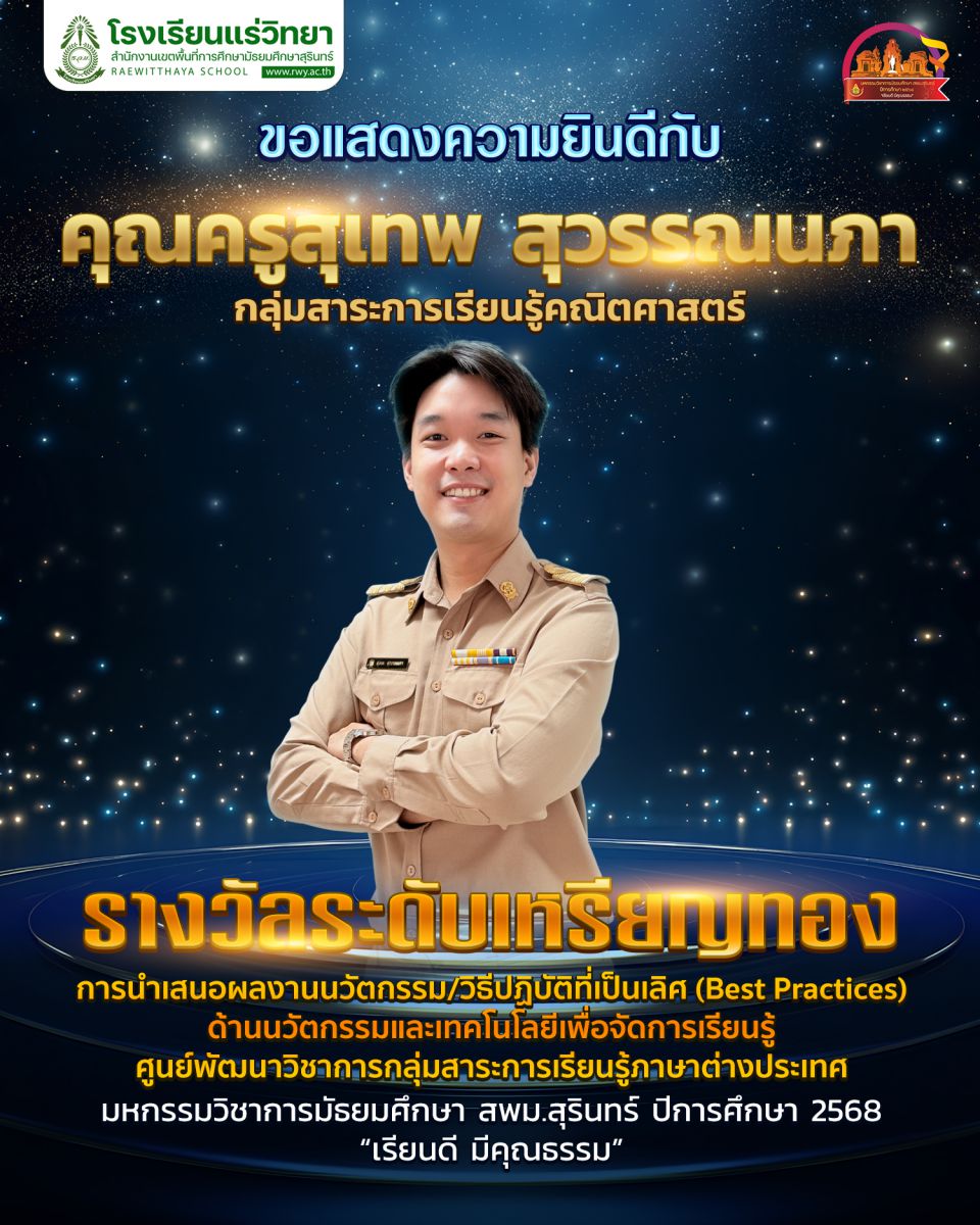 - 4. คุณครูสุเทพ สุวรรณนภา รางวัลเหรียญทอง การประกวดวิธีปฏิบัติที่เป็นเลิศ (Best Practices) ด้านนวัตกรรมและเทคโนโลยีเพื่อการเรียนการสอน ประเภท การพัฒนาการจัดการเรียนรู้โดยการเปิดชั้นเรียน (Lesson Study) กลุ่มสาระการเรียนรู้คณิตศาสตร์