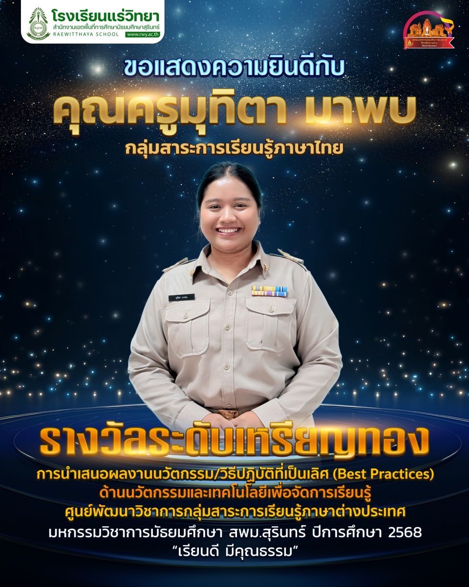 - 5. คุณครูมุทิตา มาพบ รางวัลเหรียญทอง การประกวดวิธีปฏิบัติที่เป็นเลิศ (Best Practices) ด้านนวัตกรรมและเทคโนโลยีเพื่อการเรียนการสอน ประเภท สื่อและเทคโลโลยีการจัดการเรียนรู้ กลุ่มสาระการเรียนรู้ภาษาไทย