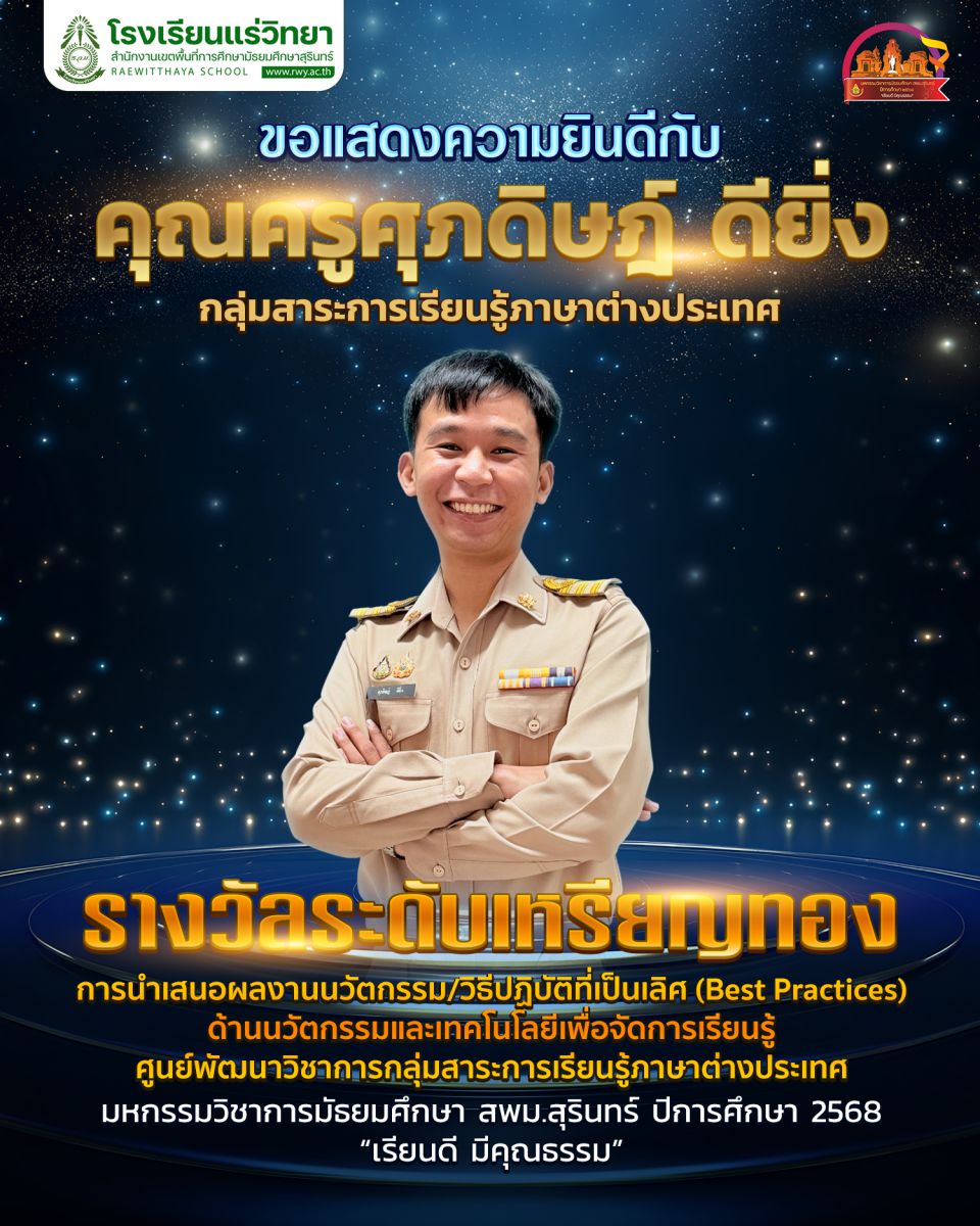 - 6. คุณครูศุภดิษฎ์ ดียิ่ง รางวัลเหรียญทอง การประกวดวิธีปฏิบัติที่เป็นเลิศ (Best Practices) ด้านนวัตกรรมและเทคโนโลยีเพื่อการเรียนการสอน ประเภท นวัตกรรมการจัดการเรียนรู้ กลุ่มสาระการเรียนรู้ภาษาต่างประเทศ