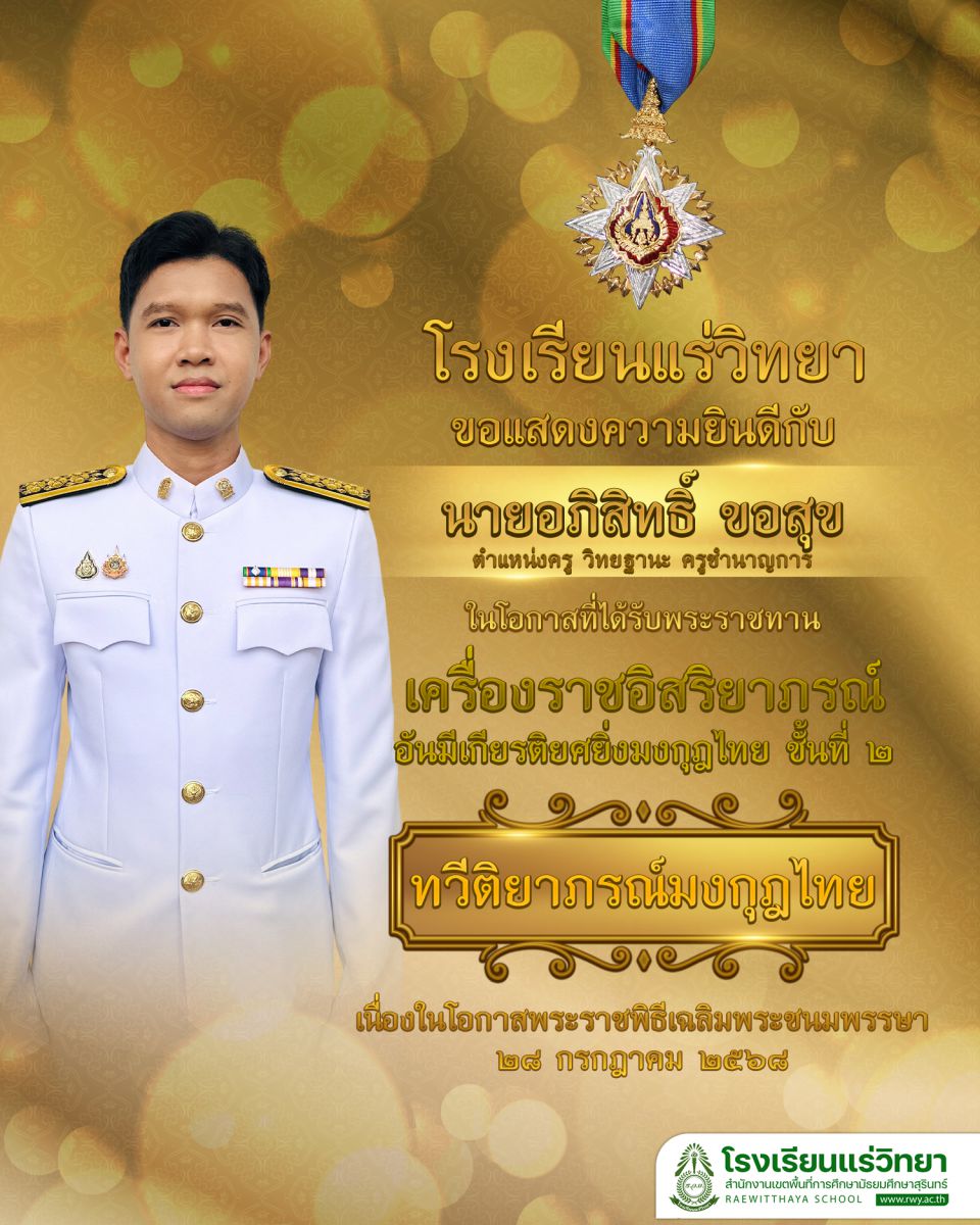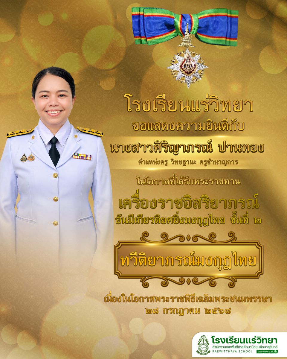 โรงเรียนแร่วิทยา ขอแสดงความยินดีกับข้าราชการครูและบุคลากร ที่มีราชชื่อรับพระราชทานเครื่องราชอิสริยาภรณ์ ชั้นต่ำกว่าสายสะพาย ประจำปี ๒๕๖๘ เนื่องในโอกาสพระราชพิธีเฉลิมพระชนมพรรษา ๒๘ กรกฎาคม ๒๕๖๘
