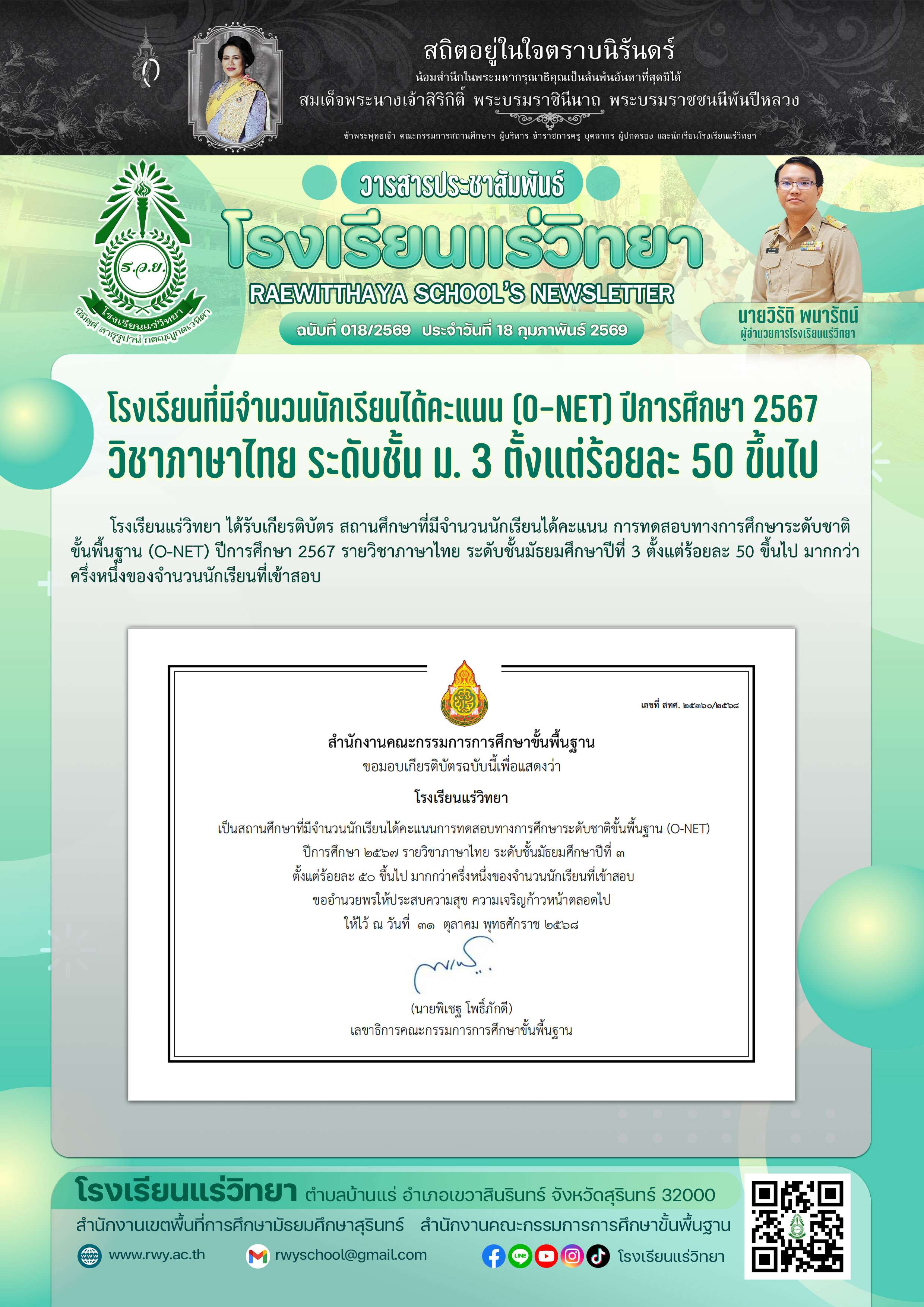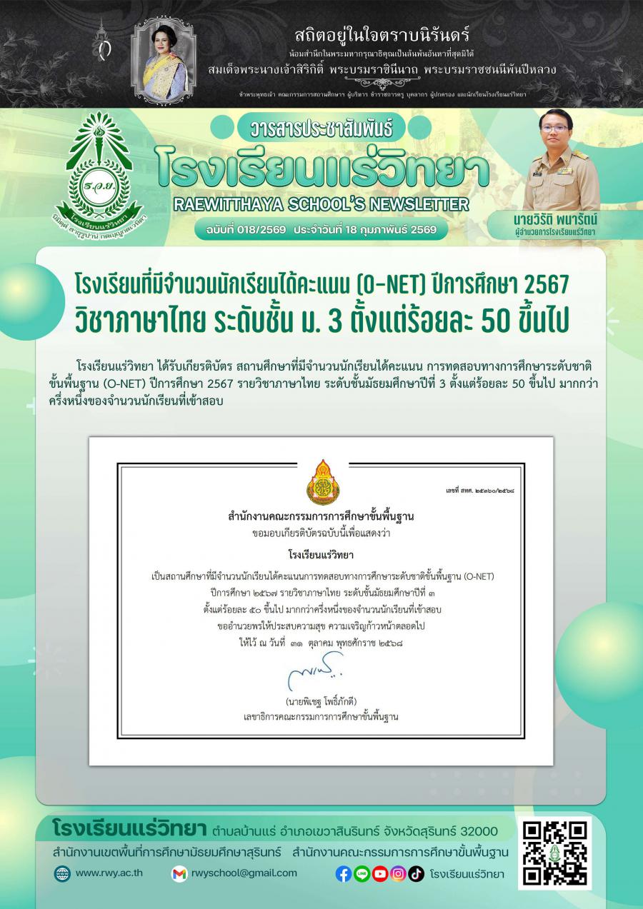 คะแนน O-NET ภาษาไทย 50% ของนักเรียนที่เข้าสอบ